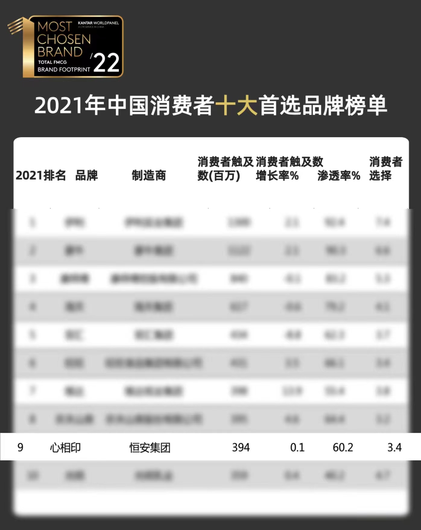 心相印蟬聯2021年“中國區消費者首選前十品牌”